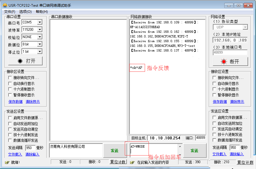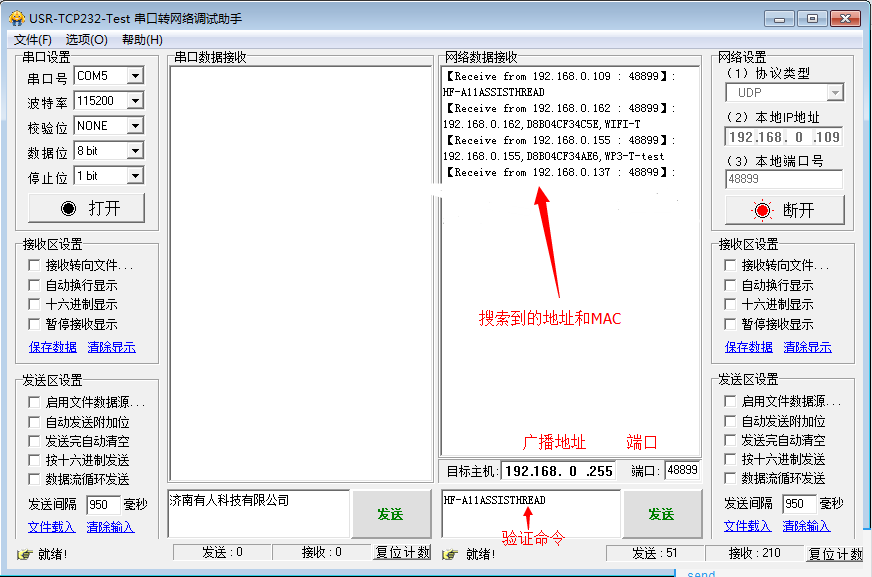 搜索模塊發(fā)送UDP數(shù)據(jù)包返回模塊ip和mac地址。