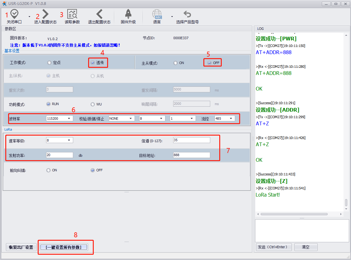 打開LoRa設(shè)置軟件(LG207和LG206-P選擇同一個),依次點擊打開串口(選擇A、B對應(yīng)的串口號,串口參數(shù):115200,None,8,1,NFC)、進(jìn)入配置狀態(tài)、讀取參數(shù)、配置上表中的參數(shù)、一鍵設(shè)置所有參數(shù),關(guān)閉LoRa設(shè)置軟件。