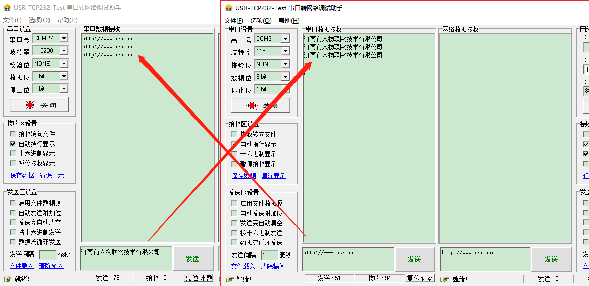 (3)啟動兩個USR-TCP232-Test(模擬串口設(shè)備1,2)分別連接LoRa數(shù)傳終端A、B的串口,使用串口設(shè)備1發(fā)送數(shù)據(jù)串口設(shè)備2可接收數(shù)據(jù)(反之亦然),通信效果如下圖所示: