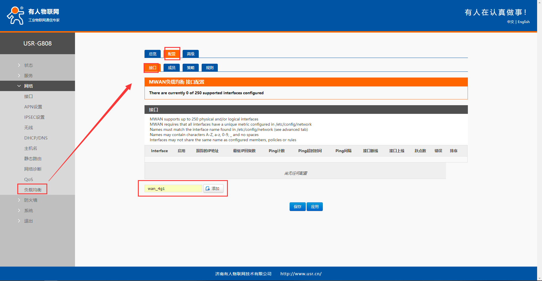 點(diǎn)擊配置----接口,創(chuàng)建接口兩個(gè)(接口名稱可以自定義),這里是 wan_4g1 和 wan_4g2 后,點(diǎn)擊添加。注意:這個(gè)接口的名字必須和上面的接口處的名字一樣。