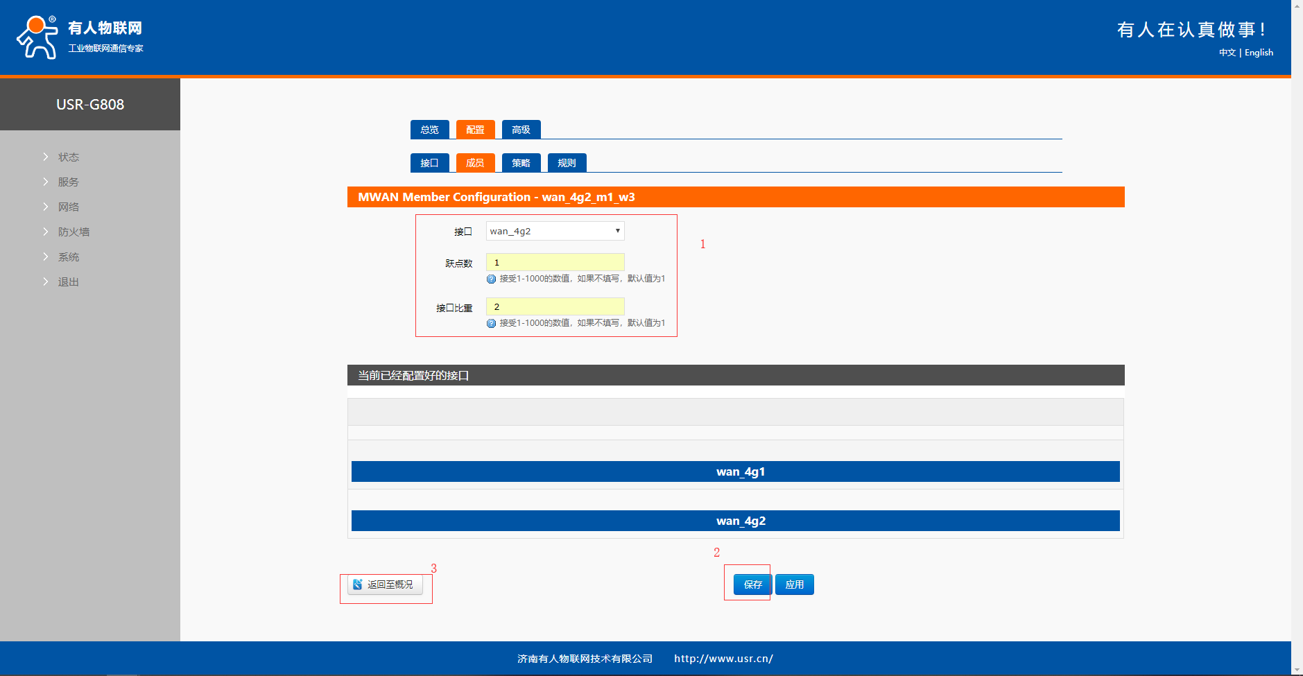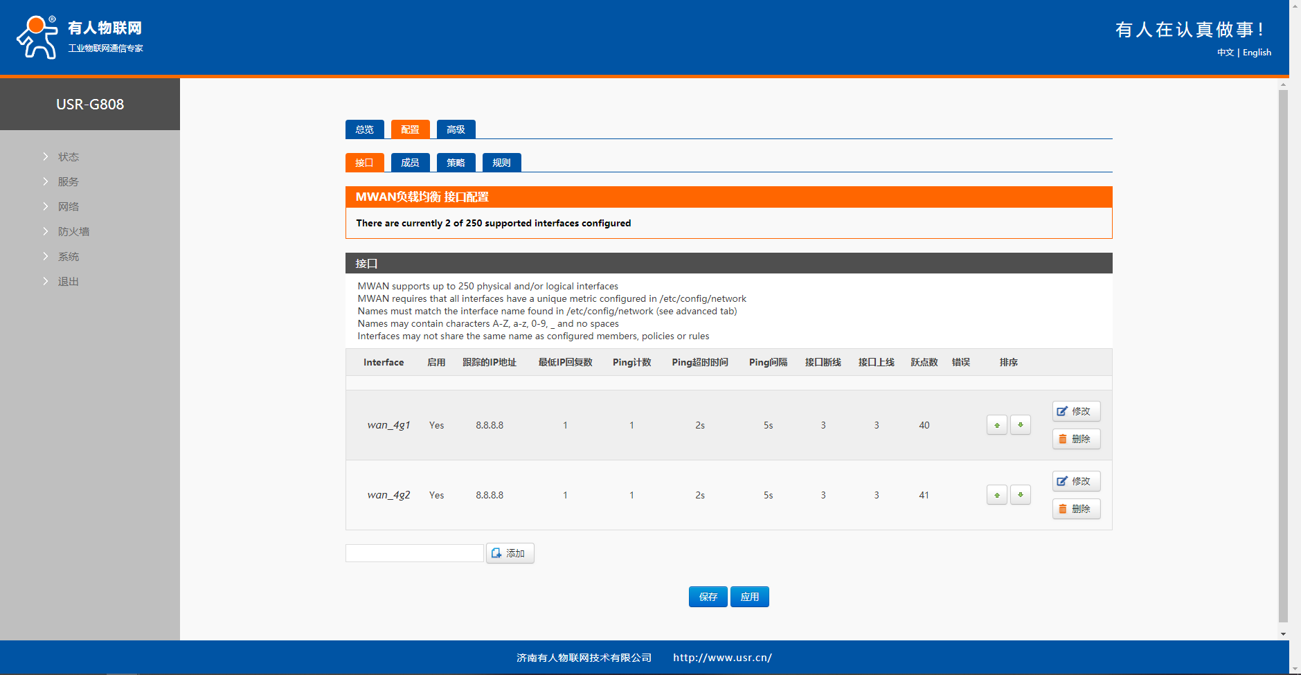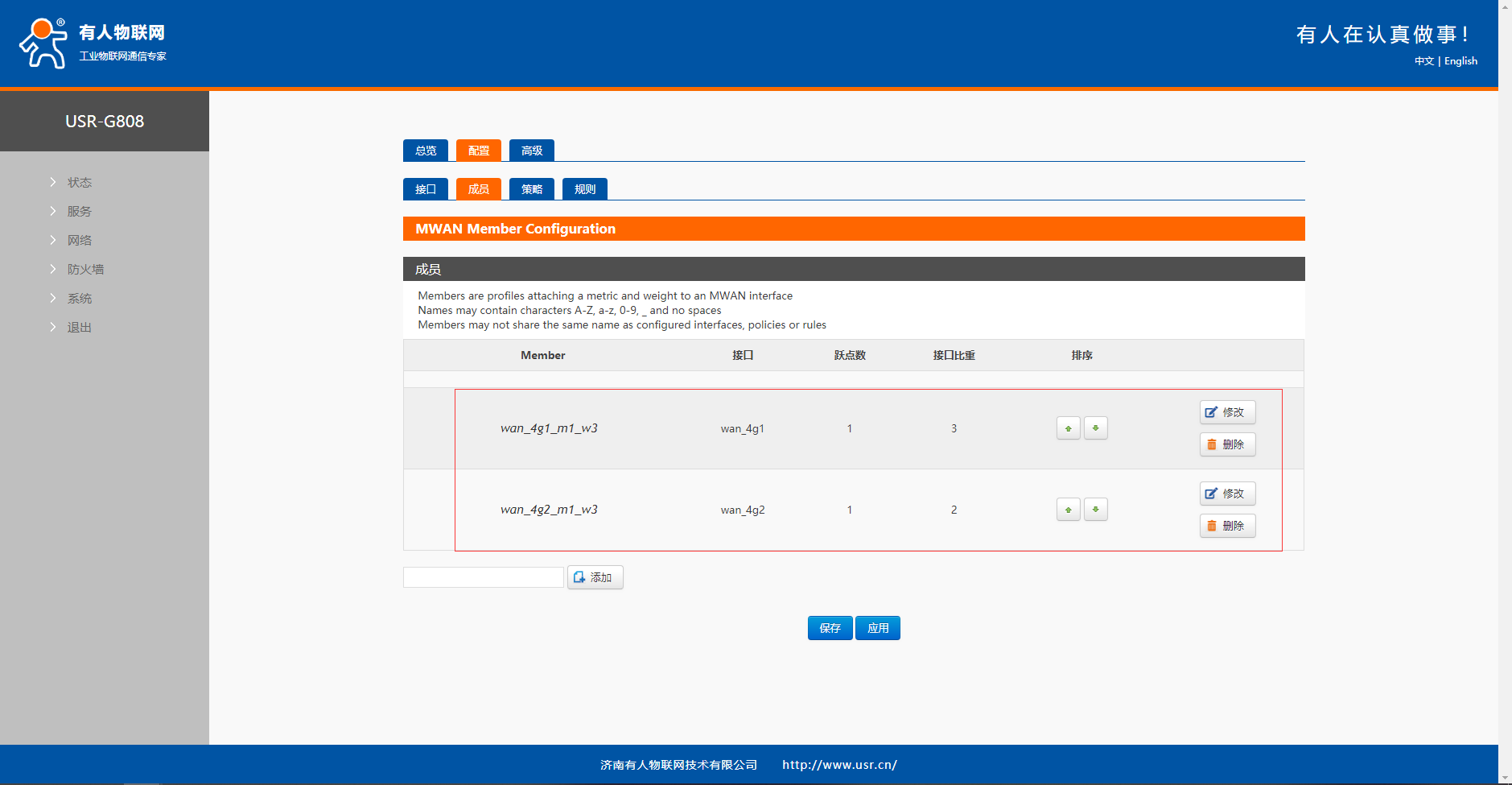 點(diǎn)擊配置----成員進(jìn)入成員配置界面。添加成員(成員名稱可以自定義),這里是 wan_4g1_m1_w3 和 wan_4g2_m1_w3 后,點(diǎn)擊添加