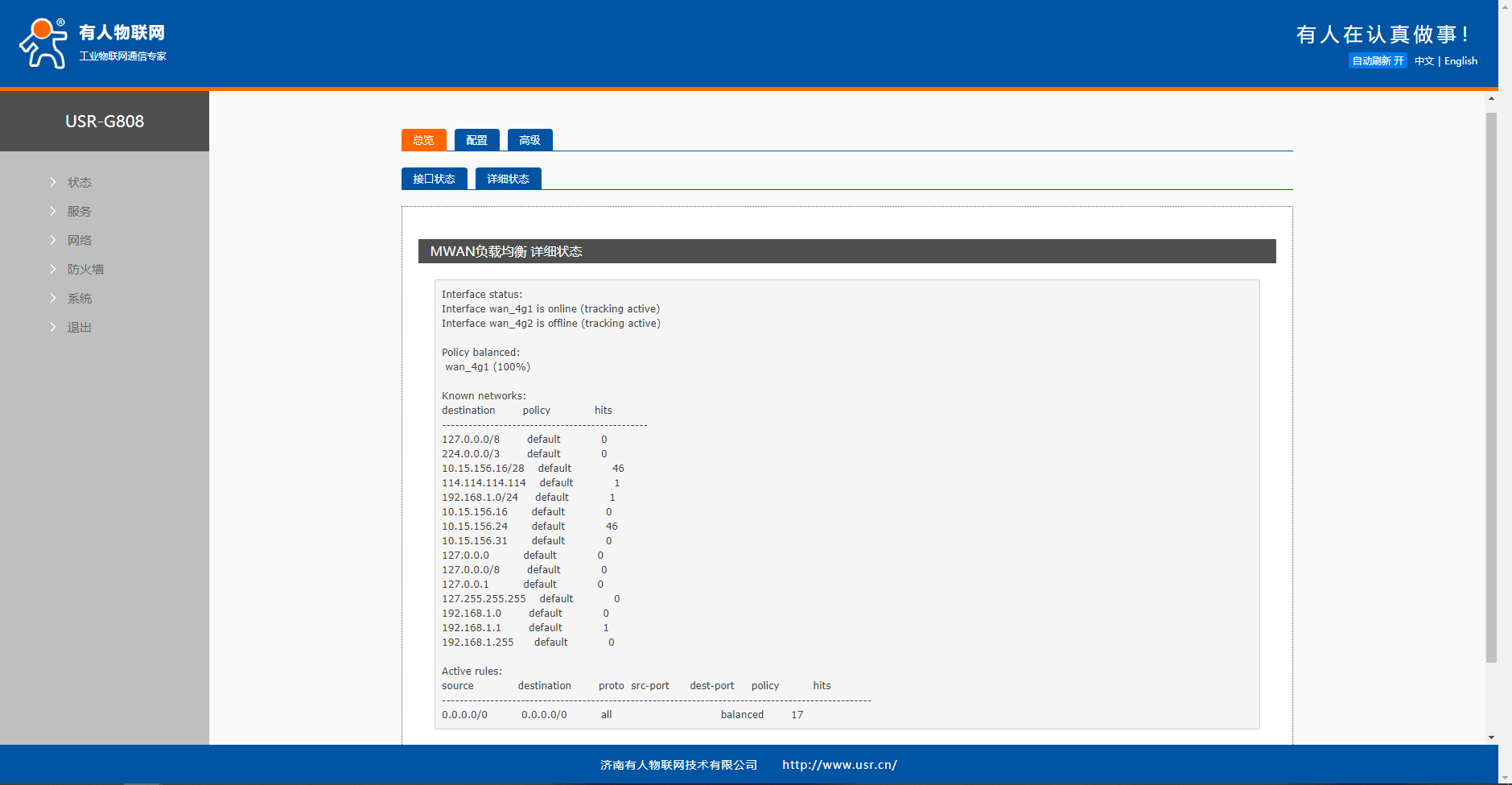 待設(shè)備重啟完畢后,可以在總覽里點(diǎn)擊接口狀態(tài),發(fā)現(xiàn)兩個(gè)接口變成綠色表示配置成功,紅色表示沒有成功。在詳細(xì)狀態(tài)里面可以看到兩個(gè)接口的進(jìn)行的負(fù)載占比。