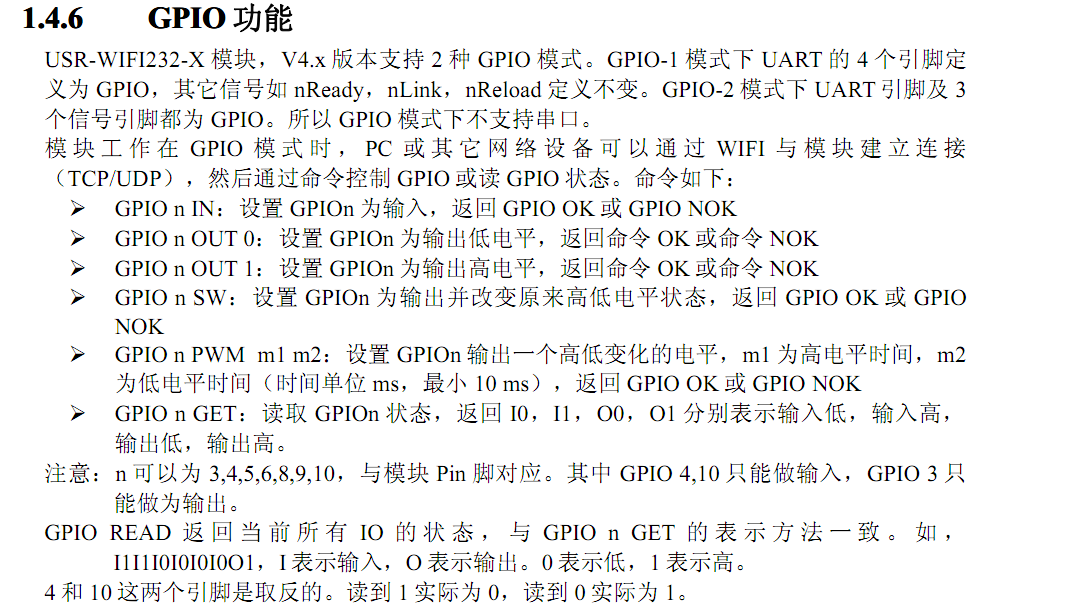 GPIO 4 ,10 只能做輸入,GPIO 3只能做輸出。 GPIO功能在AP模塊下也可以使用,建立網(wǎng)絡(luò)連接和socket連接,發(fā)送指令??梢钥刂艷PIO。