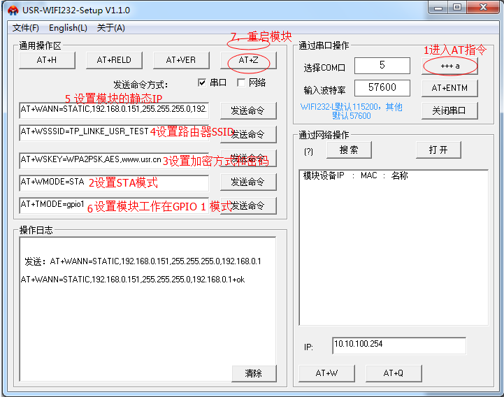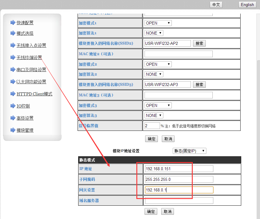 2:無線終端設(shè)置:設(shè)置模塊連接的路由器SSID和密碼。給模塊設(shè)置一個(gè)靜態(tài)IP。
