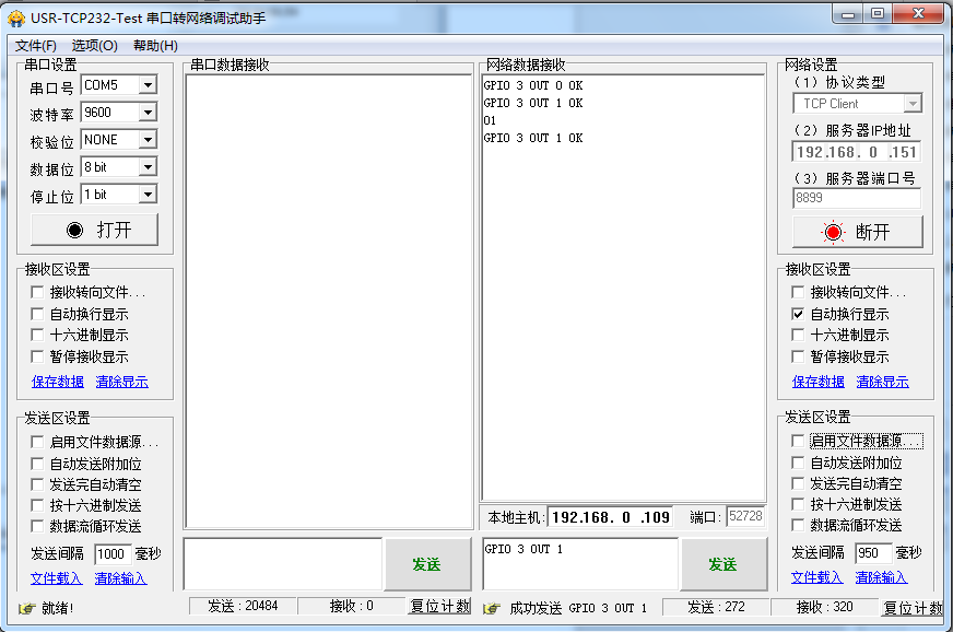 6:通過網(wǎng)絡(luò)發(fā)送GPIO指令。 發(fā)送第3腳輸出高電平。