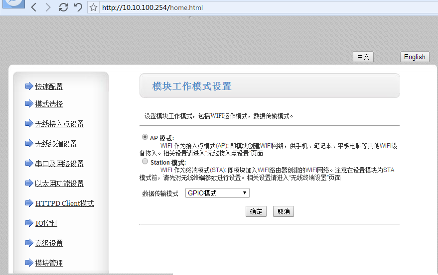 1:網(wǎng)頁(yè)設(shè)置界面: station 模式,數(shù)據(jù)傳輸模式 GPIO模式.