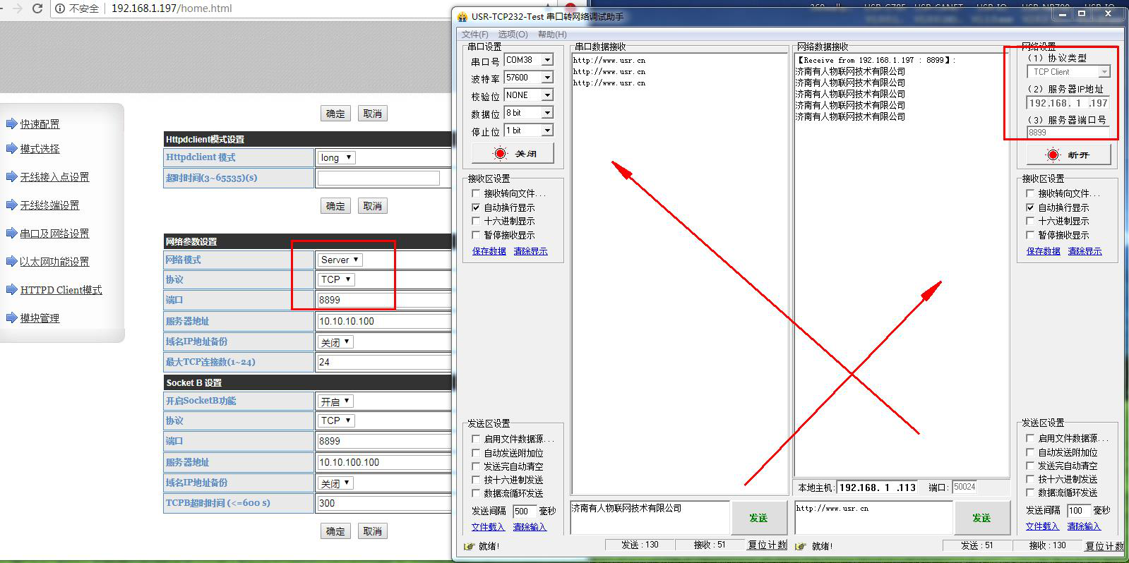 用USR-W610的IP 登錄USR-W610的網(wǎng)頁,然后修改W610的串口參數(shù)。測試4種工作模式下,串口和網(wǎng)絡(luò)的數(shù)據(jù)透傳。