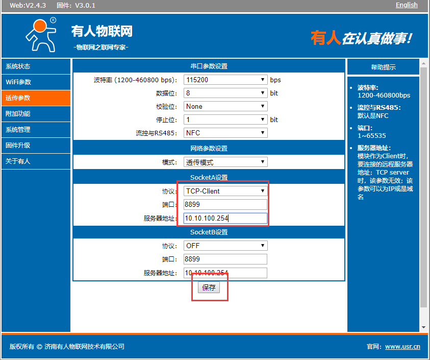 設(shè)為AP模式的216做server,此處以8899為例(端口號(hào)可設(shè)),ip地址為216本身的ip,設(shè)置完成后,點(diǎn)擊保存,點(diǎn)擊重啟,所配置的參數(shù)均在重啟后生效