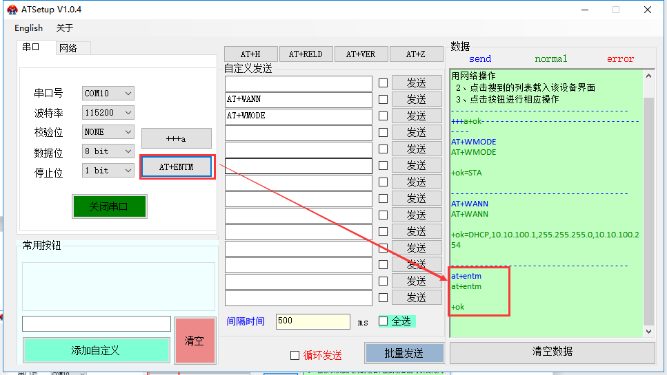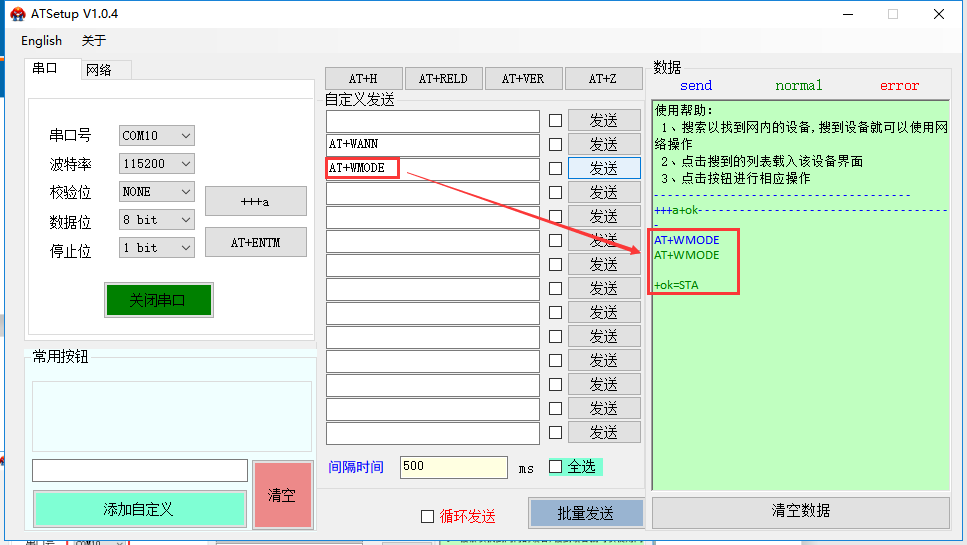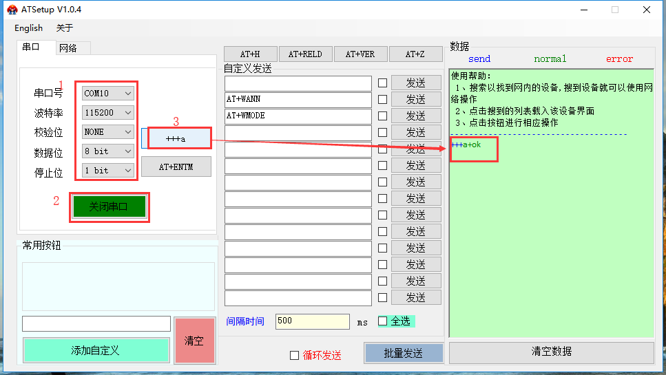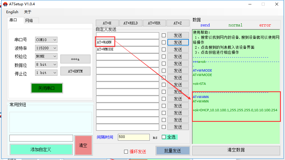 2、打開AT指令軟件,選擇相應(yīng)的串口號(hào),以及串口參數(shù)(默認(rèn):115200,N,8,1),打開串口,點(diǎn)擊“+++a”進(jìn)入配置狀態(tài),用AT指令:AT+WMODE查詢模塊所處工作模式,用AT+WANN查詢模塊的IP地址,退出配置狀態(tài),關(guān)閉串口。(其他AT指令您可以參考軟件設(shè)計(jì)手冊41頁)