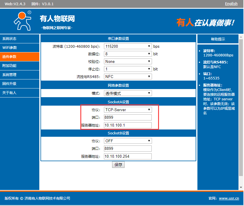 4、設(shè)為AP模式的216做server,此處以8899為例(端口號(hào)可設(shè)),ip地址為10.10.100.1,設(shè)置完成后,點(diǎn)擊保存,點(diǎn)擊重啟,所配置的參數(shù)均在重啟后生效