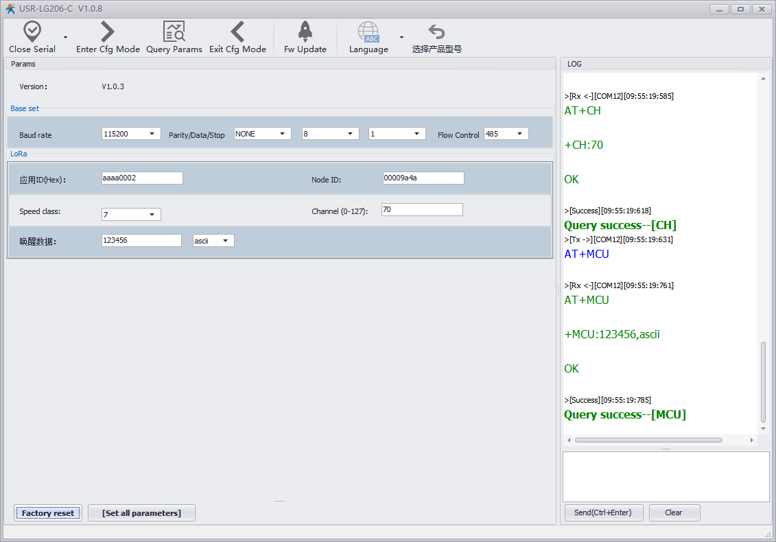 這里以有人LoRa終端USR-LG206-L-C為例。使用串口線連接LoRa終端的RS232接口與電腦,打開USR_LoRa軟件(http://www.lifj.com.cn/Down/USR_LoRa_SET-V1.0.8.rar),選擇LG206-C。