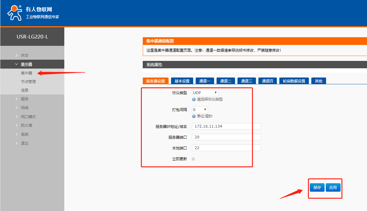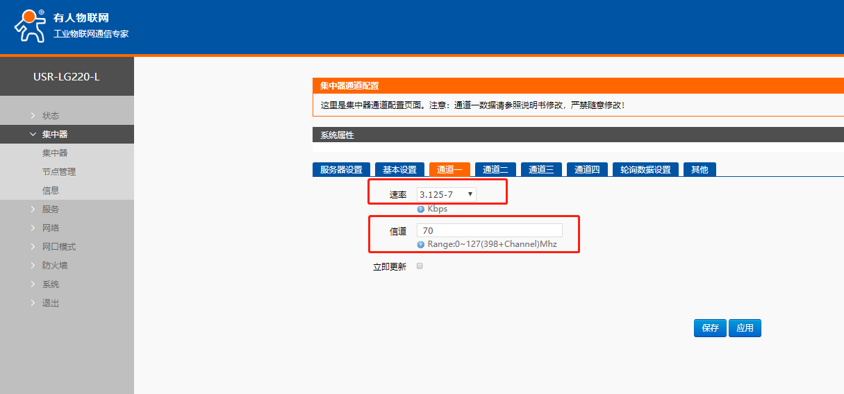 (5)設(shè)置集中器的信道和速率,依次點(diǎn)擊集中器,通道一設(shè)置速率和信道和lora相同,點(diǎn)擊保存應(yīng)用,通道二、三、四中設(shè)置的速率與信道各不相同,且都與通道一不同。