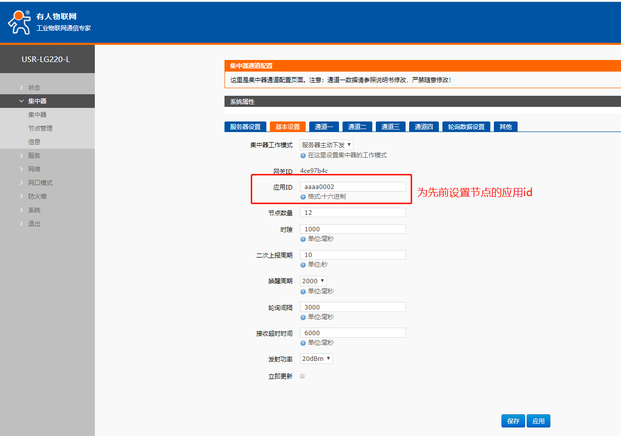 (4)設(shè)置集中器的應(yīng)用ID,依次點(diǎn)擊集中器,基本設(shè)置,應(yīng)用ID,設(shè)置應(yīng)用ID和lora相同。最后保存應(yīng)用。