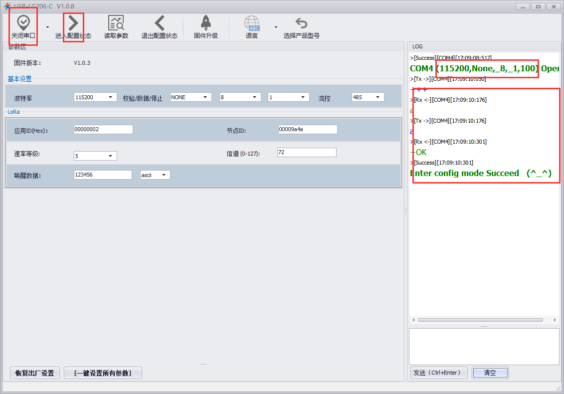 1、打開串口,進入配置狀態(tài),206-L-C默認參數(shù):115200,N,8,1