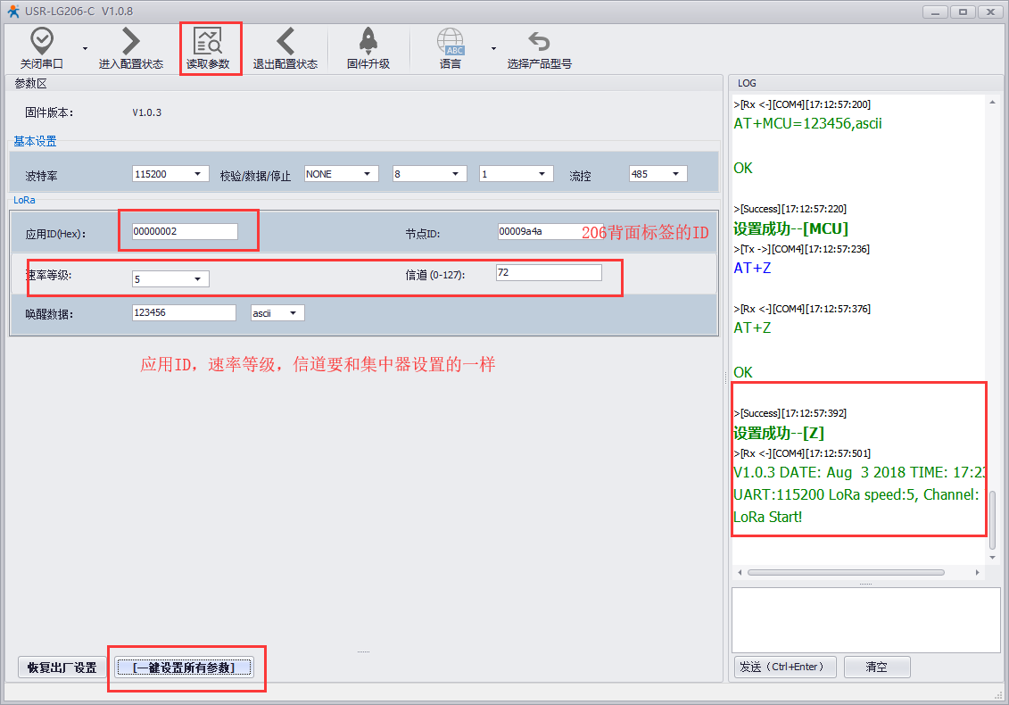 2、點擊讀取參數(shù),設(shè)置參數(shù),保證應用ID(可設(shè)),速率等級,信道要和集中器一樣,節(jié)點ID在206背面的標簽上。設(shè)置完成后一定不要忘一鍵設(shè)置所有參數(shù)。