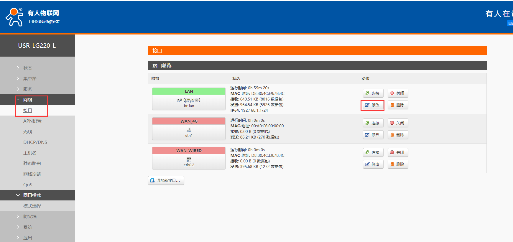 4、如果需要修改IP地址在網(wǎng)絡接口,LAN位置進行修改