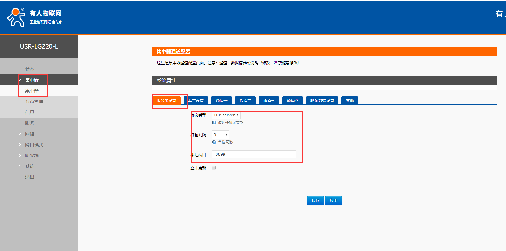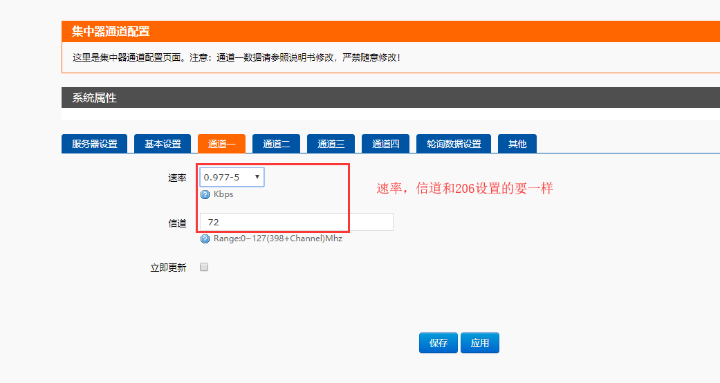 7、設(shè)置集中器的信道和速率,依次點擊集中器,通道一設(shè)置速率和信道和lora相同,點擊保存應用,通道二、三、四中設(shè)置的速率與信道各不相同,且都與通道一不同。