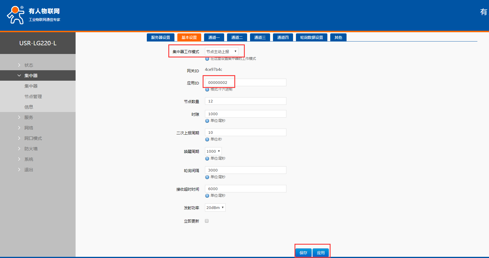 6、設(shè)置集中器的應用ID,依次點擊集中器,基本設(shè)置,應用ID(206設(shè)置的應用ID),設(shè)置應用ID和lora相同。最后保存應用。工作模式以節(jié)點主動上報為例。