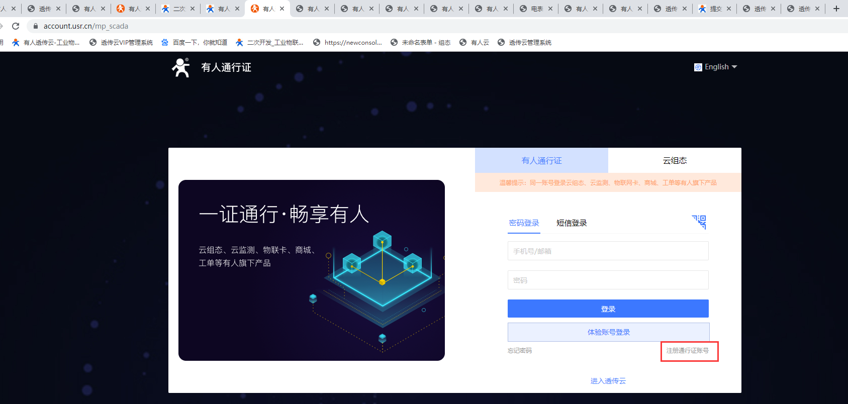 4、可以重新創(chuàng)建云組態(tài),如果以前使用過透傳云可以直接綁定透傳云的賬號,由此界面綁定物聯(lián)網(wǎng)卡平臺,工單系統(tǒng),云檢測,和商城;