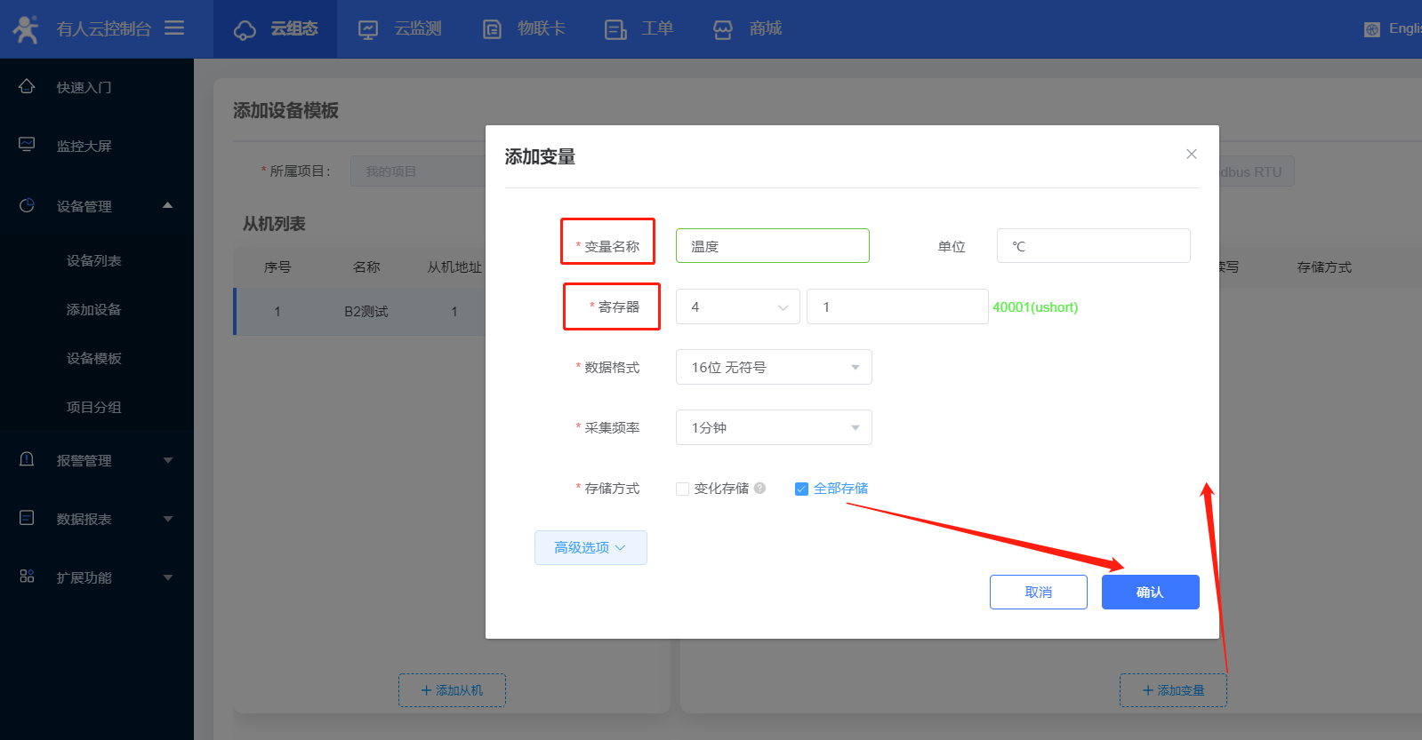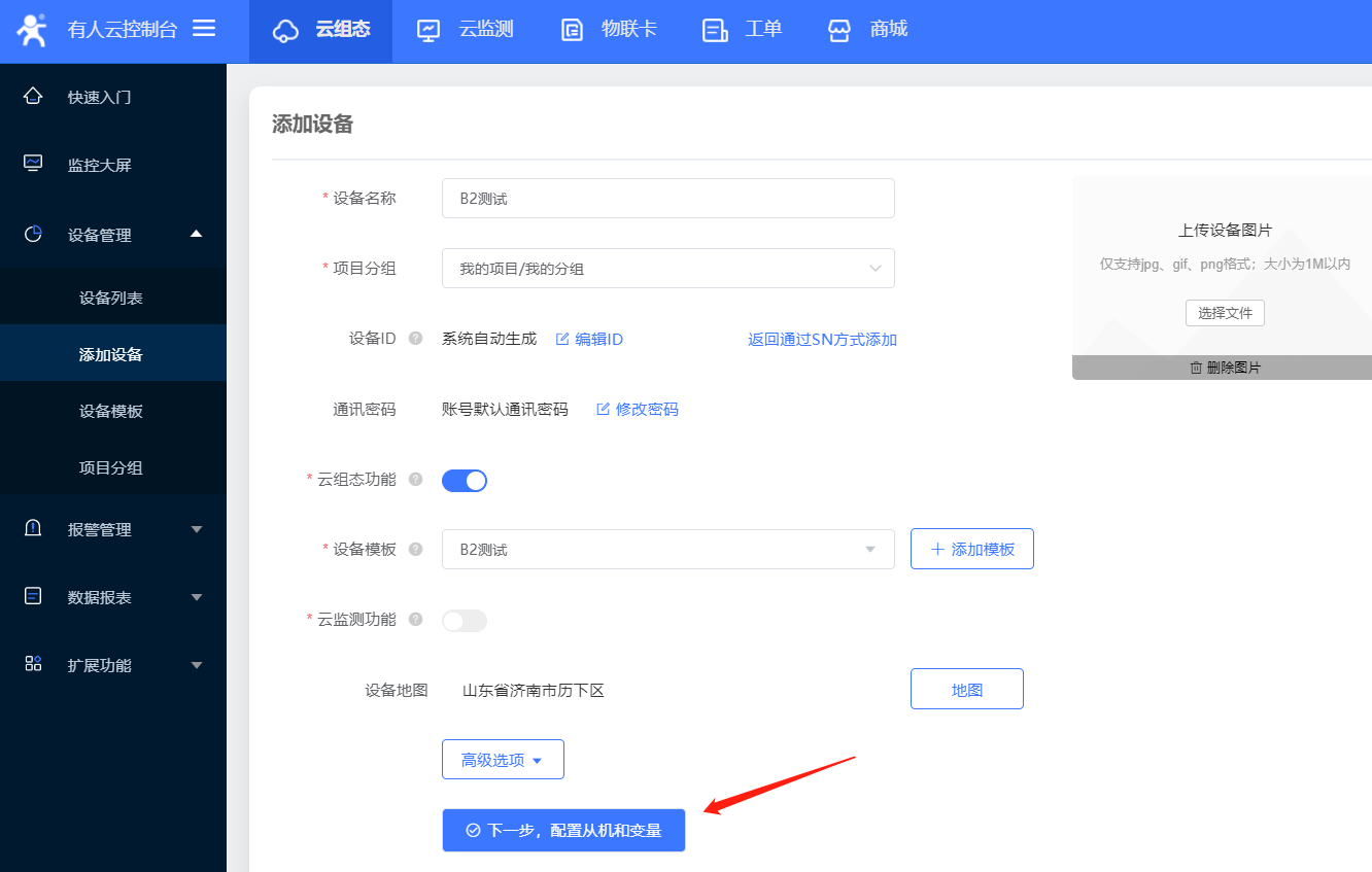 6、設置設備名稱,和項目分組,A2/B2目前只能使用ID方式添加設備id;設備id和密碼設置默認就可以,選擇云組態(tài),添加數(shù)據(jù)模板;