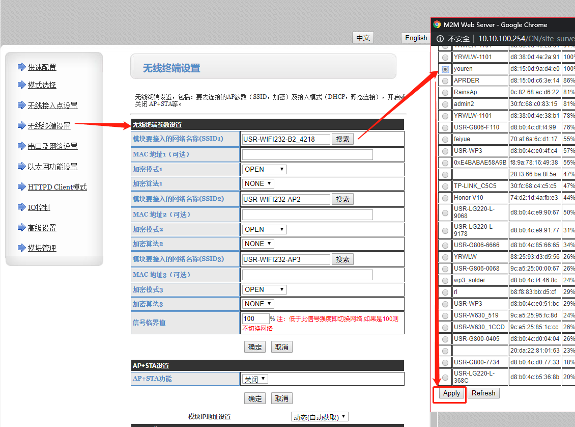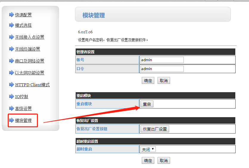 內(nèi)置網(wǎng)頁的賬號和密碼都是admin,進入以后選擇模式選擇模式選擇為sta模式,點擊確定;(先不要重啟,等設置完所有的參數(shù)再重啟設備)