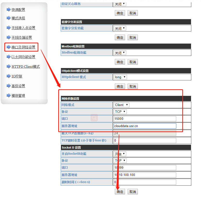 15、在串口及網(wǎng)絡參數(shù)中的網(wǎng)絡設置上設置為Tcp Client,透傳云的域名為clouddata.usr.cn,透傳云的端口為15000,設置完點擊保存;