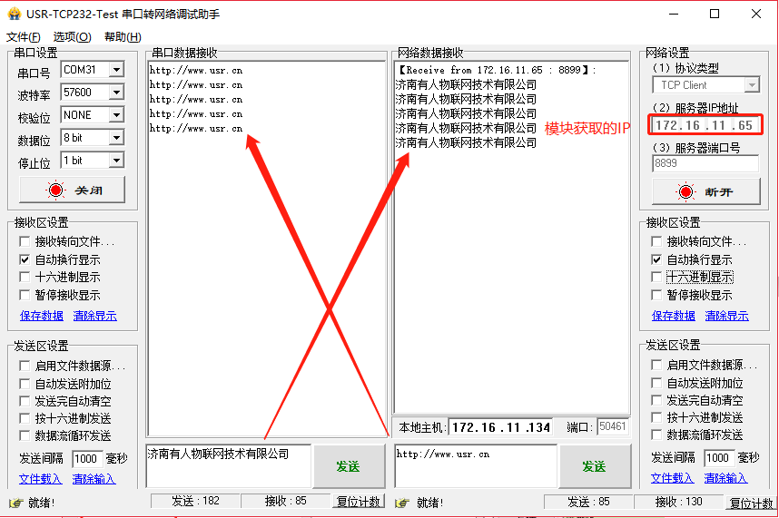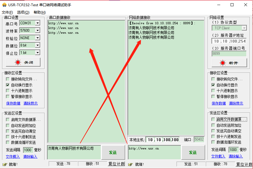 模擬數(shù)據(jù)收發(fā)測(cè)試,在實(shí)際應(yīng)用中,串口應(yīng)接在設(shè)備上,且模塊的串口參數(shù)與串口設(shè)備的參數(shù)一致。