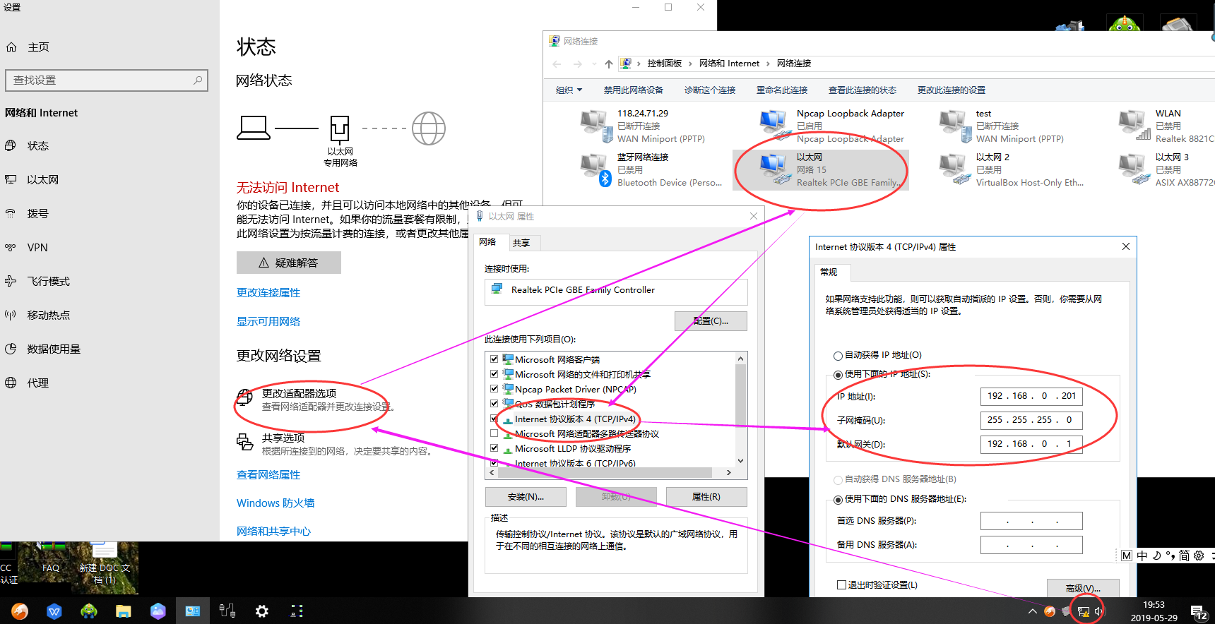 (右擊網(wǎng)絡(luò)圖標(biāo),打開網(wǎng)絡(luò)和Internet設(shè)置,更改適配器,然后選擇相應(yīng)的網(wǎng)卡,修改相應(yīng)的IP地址)