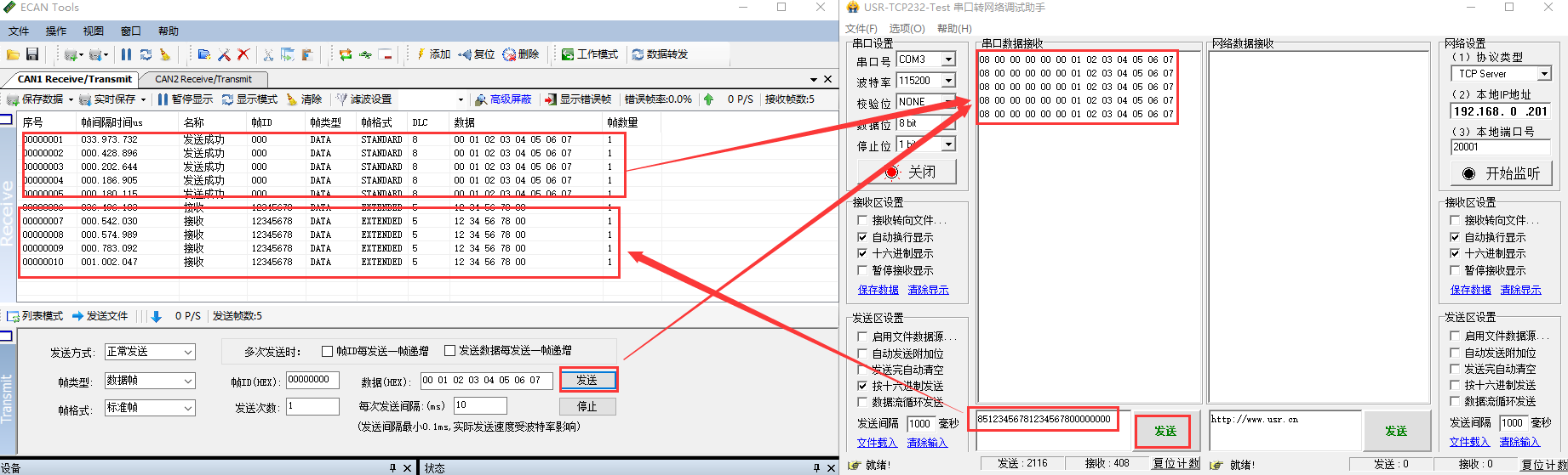 5. CAN協(xié)議數(shù)據(jù):85123456781234567800000000、05000006781234567800000000,日圖所示,實(shí)現(xiàn)485轉(zhuǎn)can的通信。