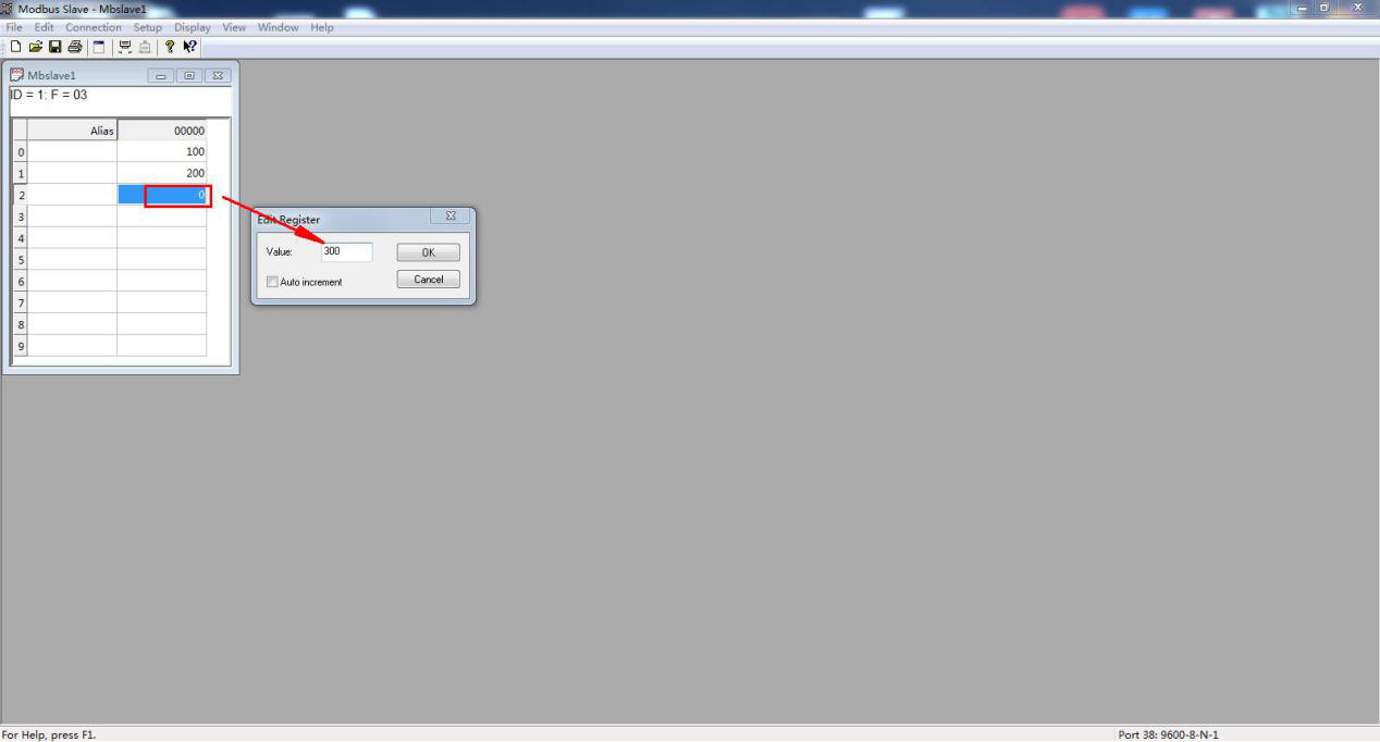 SLAVE ID設(shè)置為1,模擬串口設(shè)備ID 1。用03功能碼。寄存器起始地址設(shè)置0(十進制)。寄存器地址數(shù)量是3。點擊寄存器地址,可以修改寄存器地址中的參數(shù),依次先設(shè)置100、200、300。