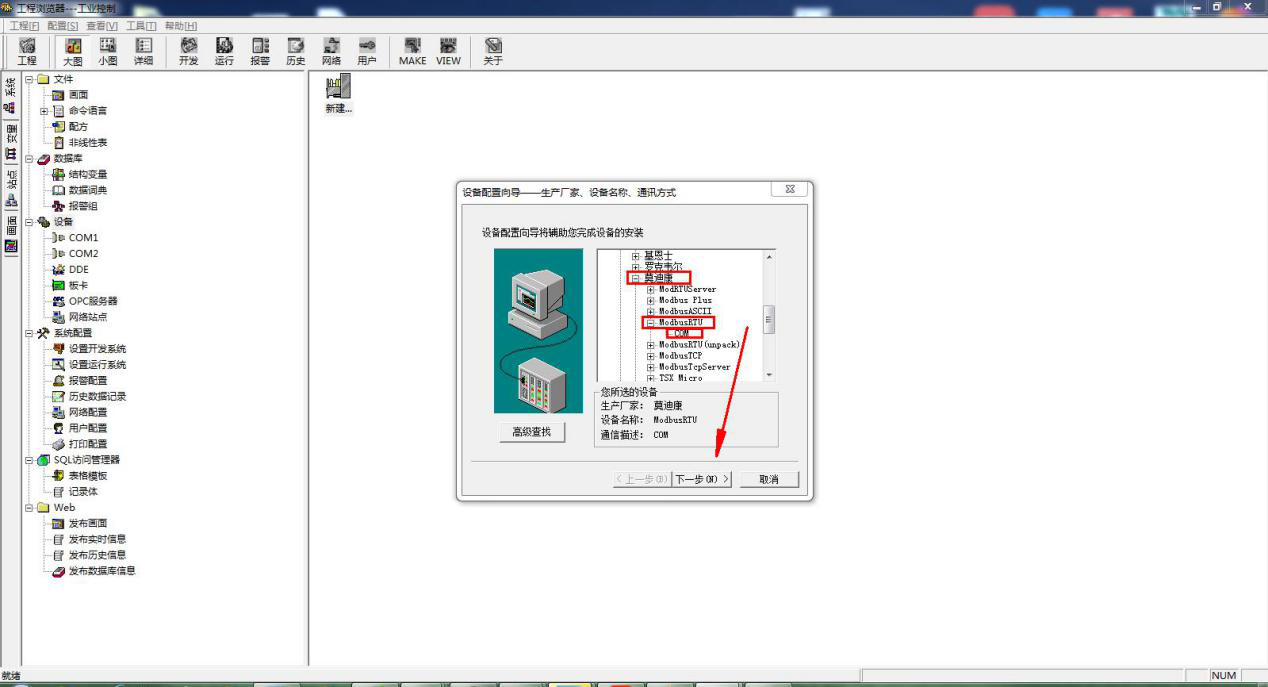 點擊設(shè)備,新建一個組態(tài)設(shè)備,選擇 Modbus RTU 標(biāo)準(zhǔn)協(xié)議的莫迪康 PLC。 下一步,選擇使用虛擬串口 COM8,下一步輸入設(shè)備ID 1。點擊新建的COM8設(shè)備,還可以修改串口參數(shù),設(shè)置和USR-N540的串口參數(shù)一致。通訊方式可以根據(jù)串口設(shè)備,選擇RS232或者RS485。
