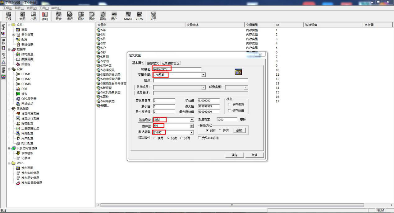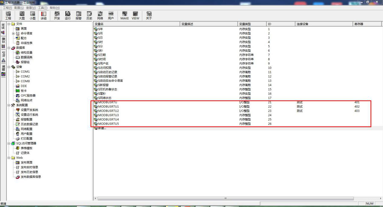新建了 6 個變量,三個 IO 變量,分別采集串口設(shè)備數(shù)據(jù)。三個內(nèi)存變量。