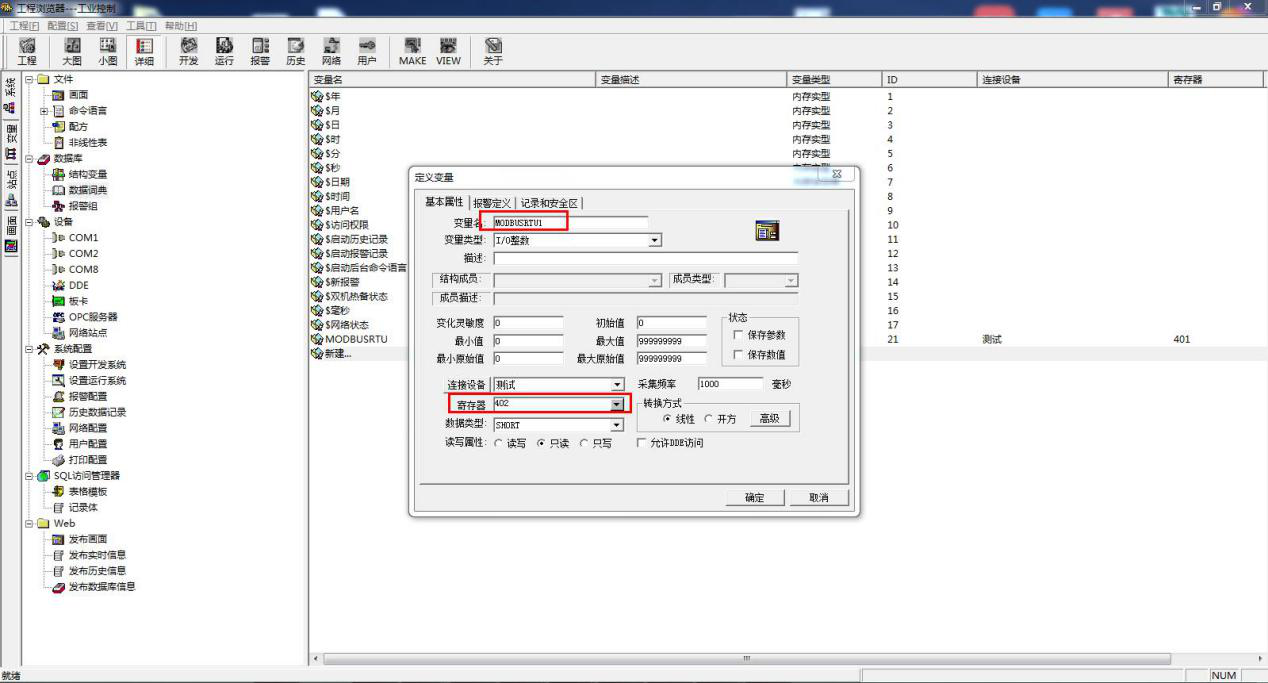 新建變量名 MODBUSRTU,選擇變量類型 IO 整數(shù)。連接設(shè)備為新建的設(shè)備 名:新建 IO 設(shè)備,寄存器 401,代表功能碼為 03,起始地址 0 的第一個值