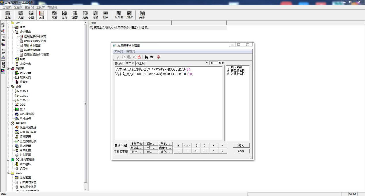 選擇命令語言的應(yīng)用程序命令語言。然后輸入算法,MODBUSRTU 變量名 采集到的數(shù)據(jù)除以 10,然后將數(shù)據(jù)賦值給 MODBUSRTU3,此變量對應(yīng)的是實 際的串口設(shè)備寄存器0地址中數(shù)據(jù)值。MODBUSRTU1 變量名采集到的數(shù)據(jù)除以 10,然后將數(shù)據(jù)賦值給 MODBUSRTU4,此變量對應(yīng)的是實 際的串口設(shè)備寄存器1地址中數(shù)據(jù)值。MODBUSRTU2 變量名采集到的數(shù)據(jù)除以 10,然后將數(shù)據(jù)賦值給 MODBUSRTU5,此變量對應(yīng)的是實 際的串口設(shè)備寄存器1地址中數(shù)據(jù)值。