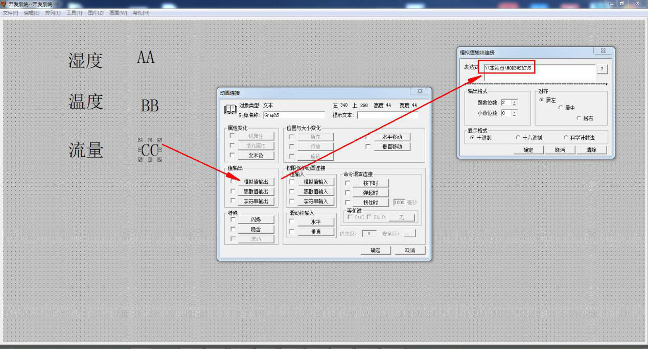 雙擊其中一個文本 CC,然后點擊模擬值輸出,在表達式內(nèi)選擇變量名 為 MODBUSRTU5,然后確定。意思是MODBUSRTU5 的值是設(shè)備寄存器地址2中的數(shù)據(jù)值,然后將數(shù)值 傳到畫面CC