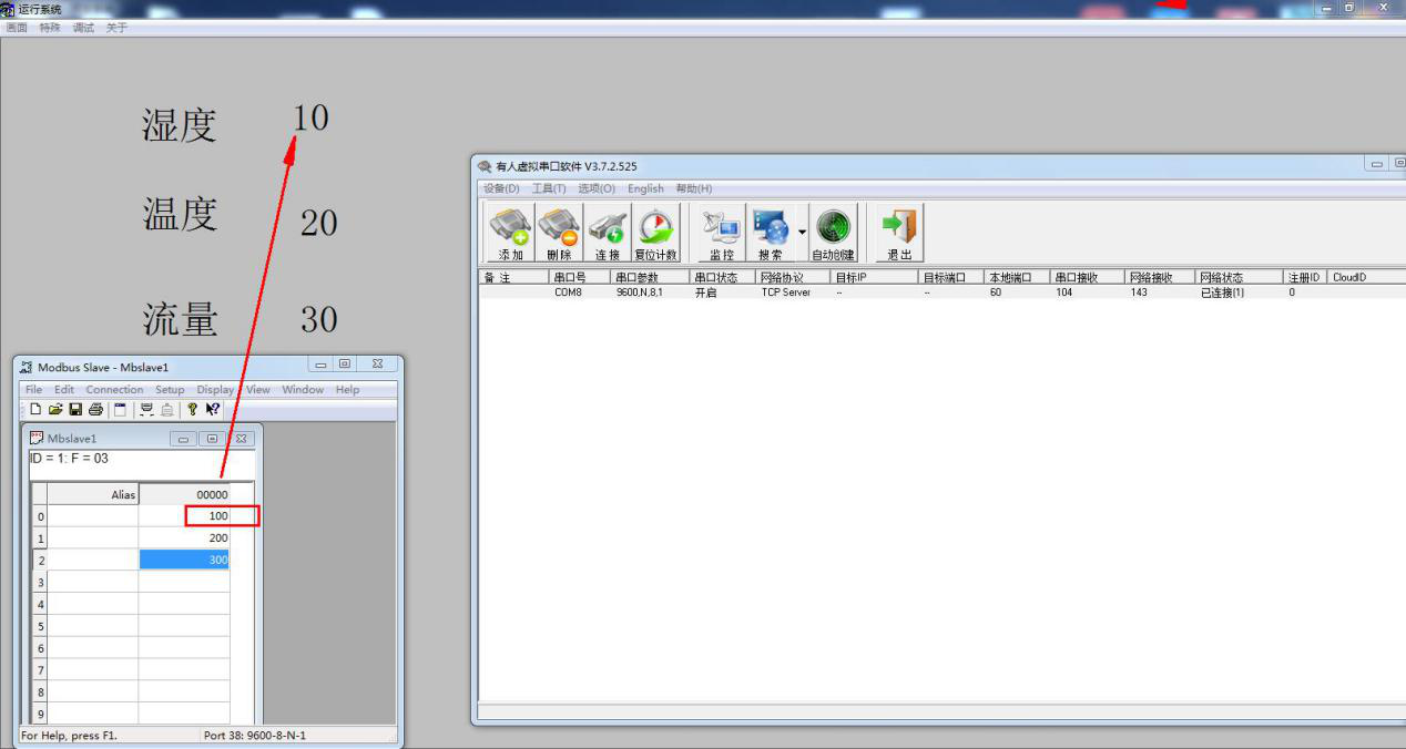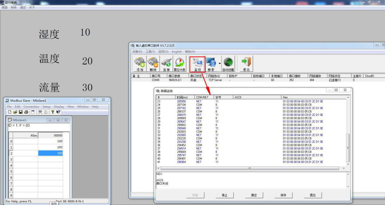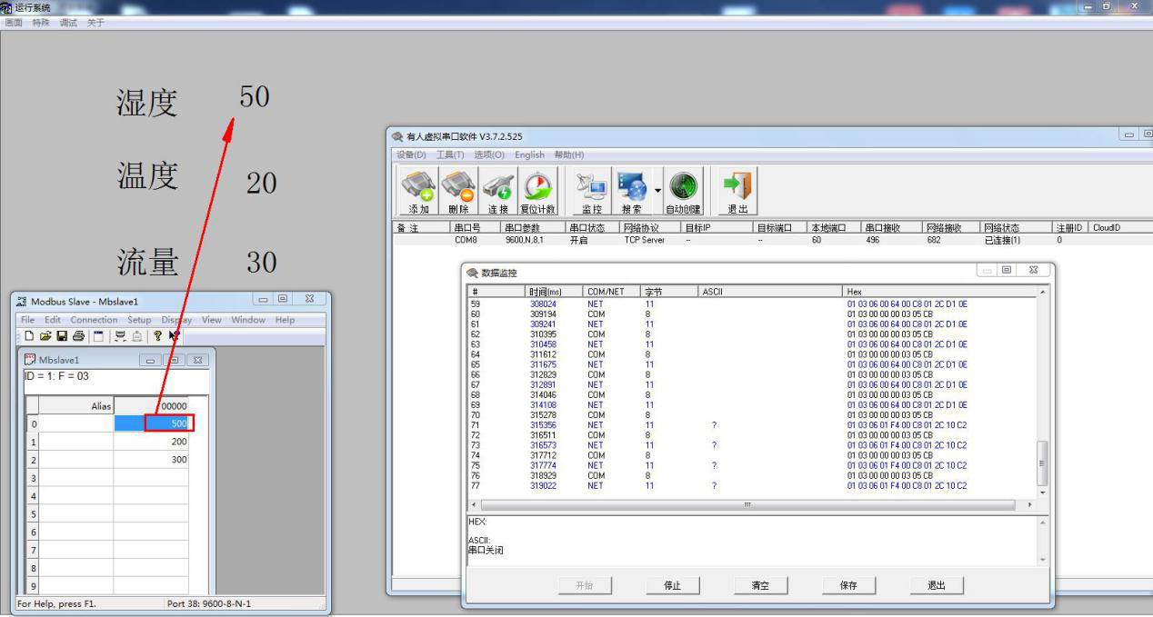 MODBUS SLAVE軟件修改3個寄存器地址數(shù)據(jù),組態(tài)王讀取到串口設(shè)備3個寄存器地址數(shù)據(jù),在頁面上顯示。