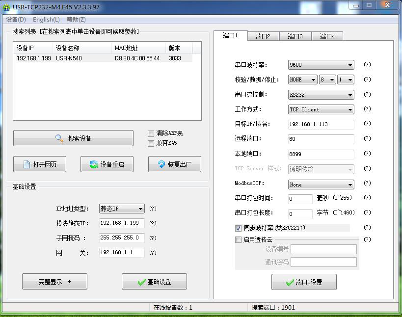 USR-N540網(wǎng)線和電腦直連,IP設(shè)置同網(wǎng)段,在電腦用M4設(shè)置軟件去搜索USR-N540的IP,設(shè)置USR-N540的參數(shù),做TCP client。遠(yuǎn)程服務(wù)器地址填電腦IP,遠(yuǎn)程端口填電腦server端口。