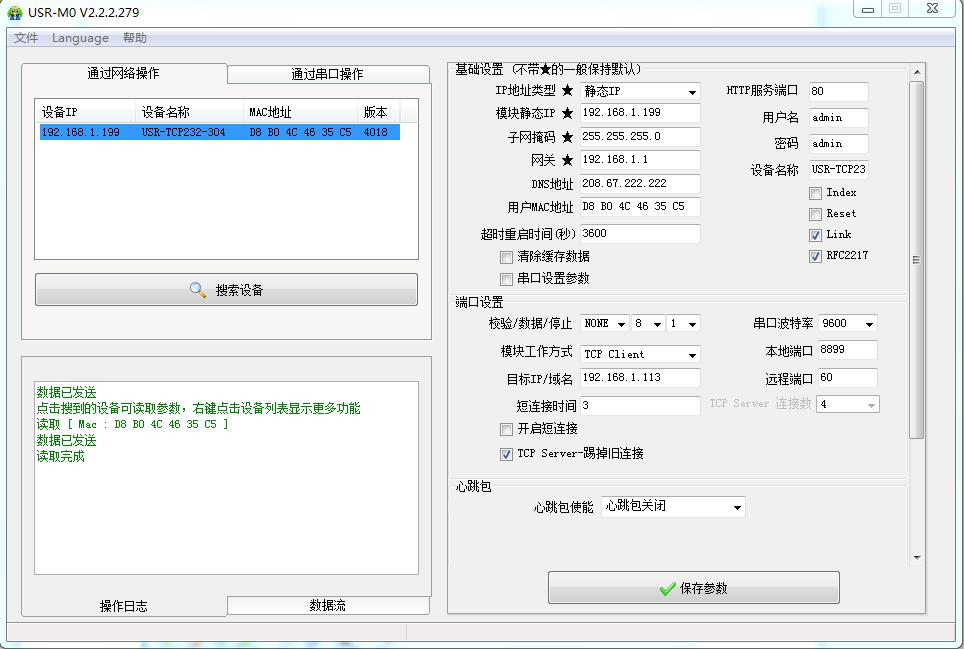 USR-TCP232-304網(wǎng)線和電腦直連,IP設置同網(wǎng)段,在電腦用M0設置軟件去搜索USR-TCP232-304的IP,設置304的參數(shù),做TCP client。遠程服務器地址填電腦IP,遠程端口填電腦server端口。