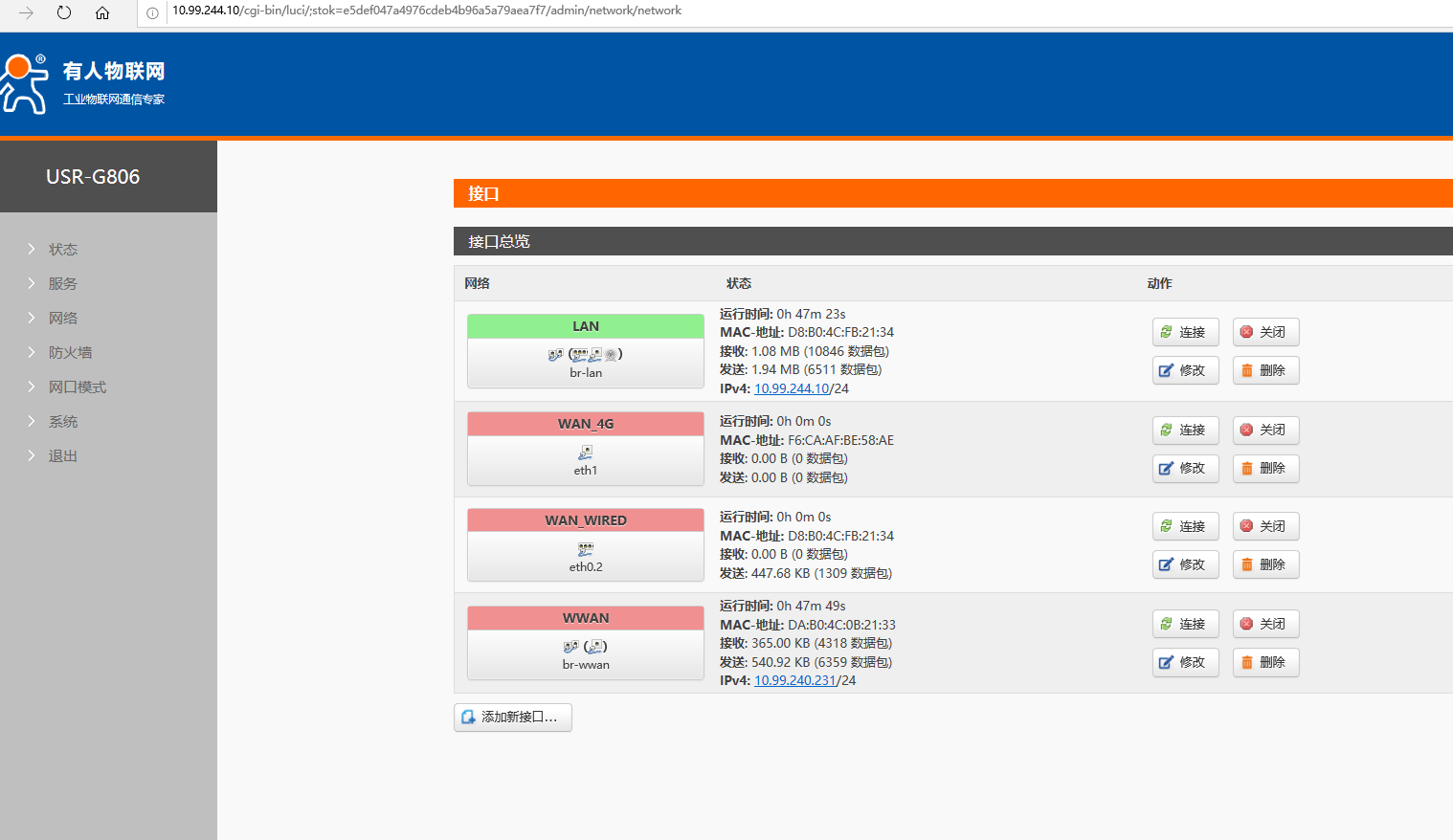 應(yīng)用完成后,會(huì)在網(wǎng)絡(luò)----接口界面生成一個(gè)WWAN接口,該接口會(huì)自動(dòng)獲取到一個(gè)IP,該IP是動(dòng)態(tài)從上級(jí)的AP路由器獲取。