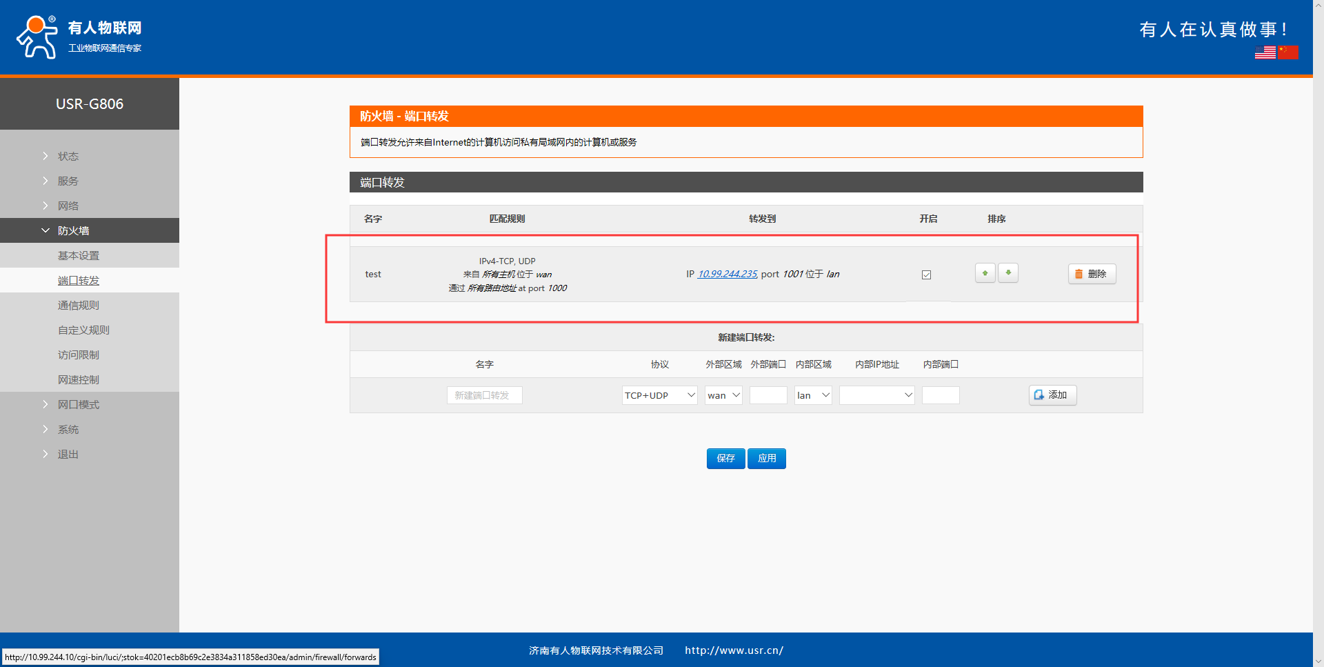 在sta路由器中防火墻中設(shè)置端口轉(zhuǎn)發(fā)(外部端口和內(nèi)部端口可以不一致),例如下圖設(shè)置外網(wǎng)端口為1000,內(nèi)部端口和上面的監(jiān)聽端口一致,為1001,保存應(yīng)用