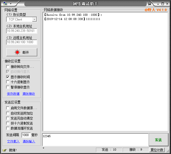 Ap下設(shè)備也更改為UDP協(xié)議,遠(yuǎn)程主機(jī)的IP就是sta路由器的WWAN口IP地址10.99.240.100,端口是映射的外部端口1000,設(shè)置完后發(fā)送數(shù)據(jù),sta下的設(shè)備就能夠識(shí)別到數(shù)據(jù)來源,然后實(shí)現(xiàn)雙向數(shù)據(jù)傳輸: