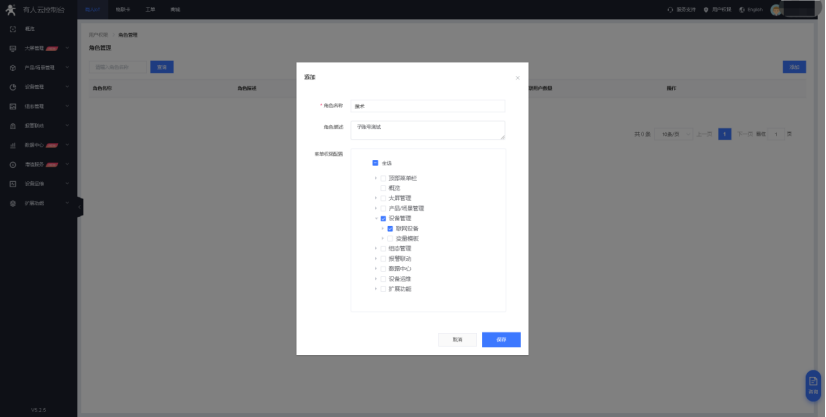 2、登錄有人云控制臺(tái)之后,點(diǎn)擊右上角的用戶權(quán)限,點(diǎn)擊角色管理。添加并填寫相關(guān)的角色信息以及菜單應(yīng)用權(quán)限。