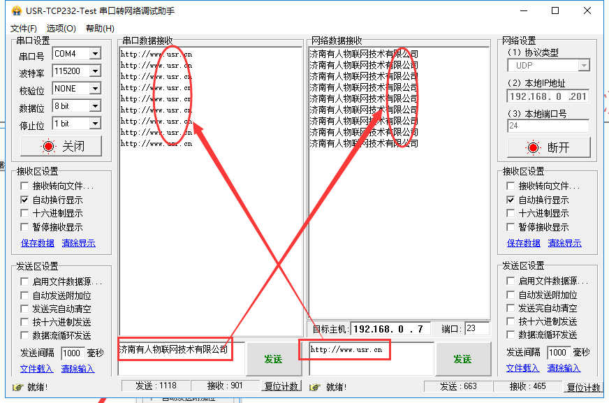 6、單擊發(fā)送,由此實現(xiàn)串口端和網絡端的通信。