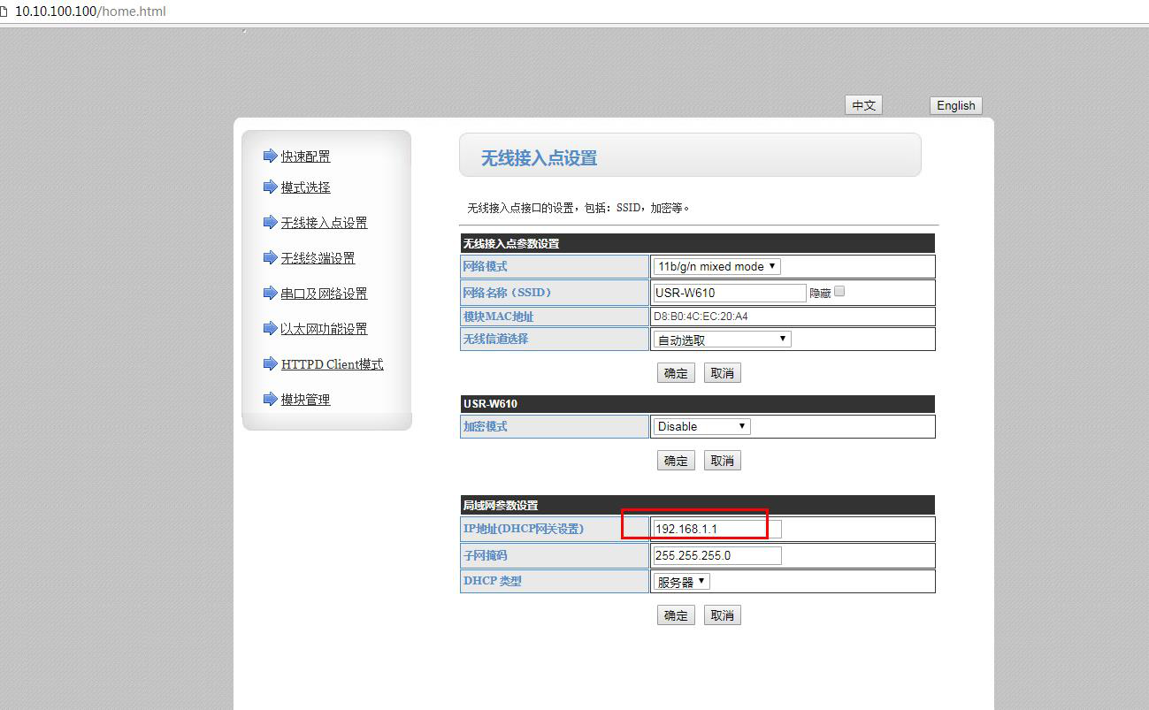 1、1號USR-W610 AP模式參數(shù)設(shè)置: