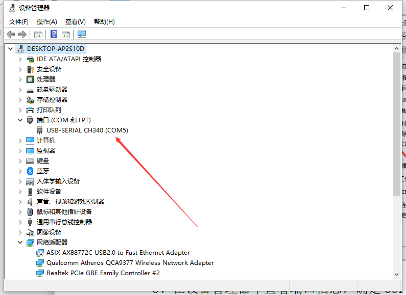 5、在設(shè)備管理器中查看端口信息,確定301串口使用的串口號(hào),如下圖所示電腦端口號(hào)為COM5。