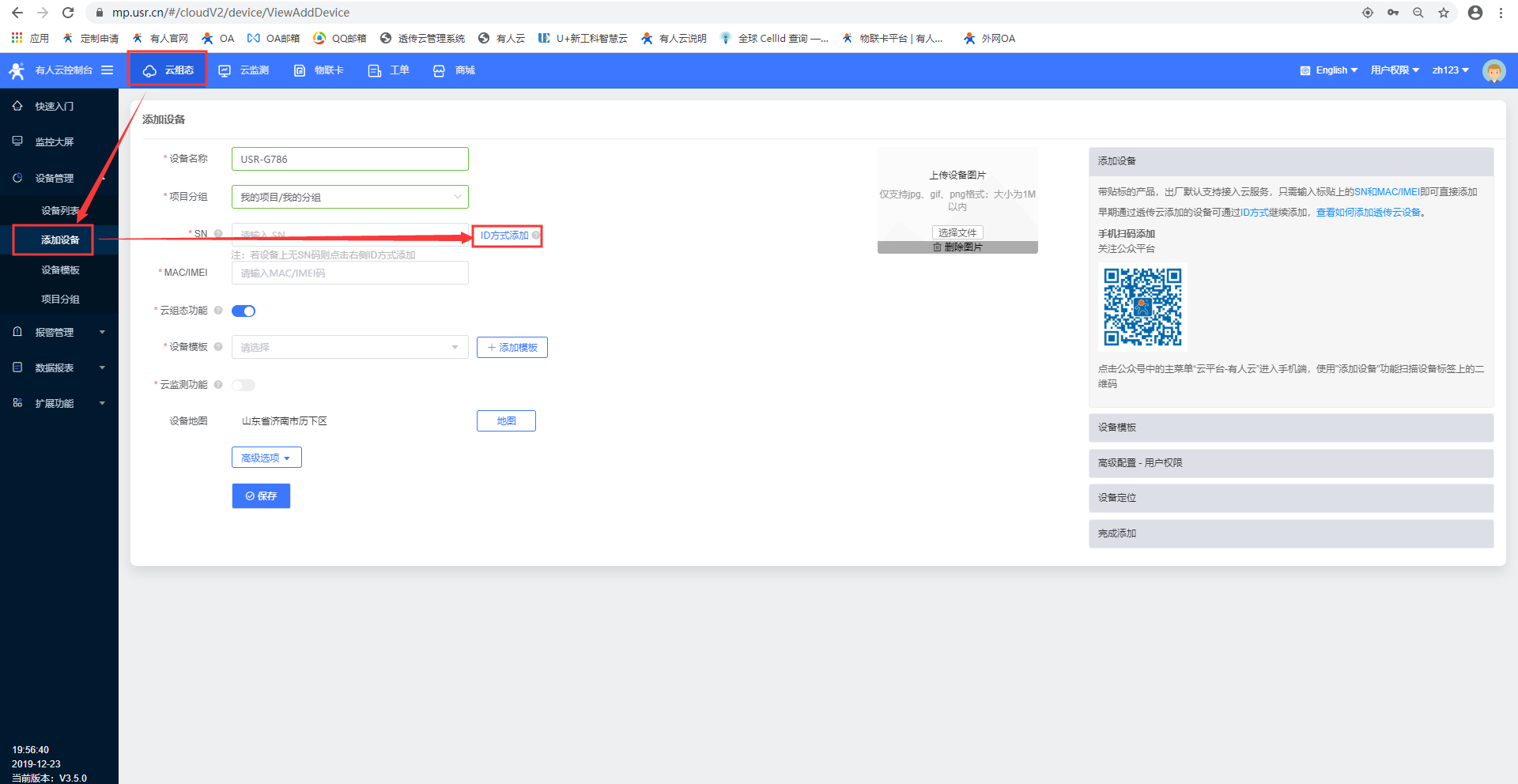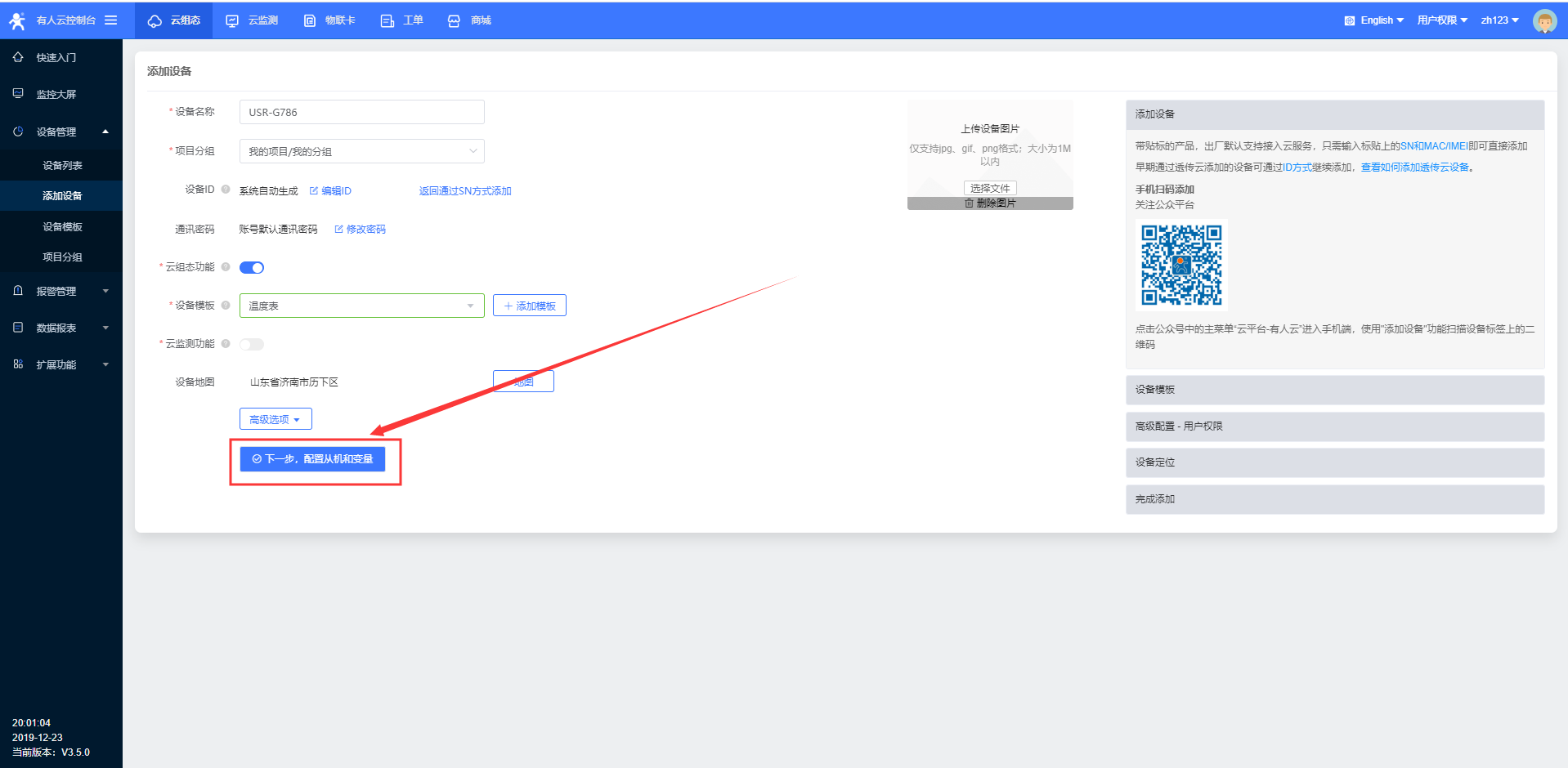 5、本次案例是USR-G786透?jìng)髂J竭B接有人云進(jìn)行數(shù)據(jù)顯示,可以進(jìn)入云組態(tài),選擇添加設(shè)備;