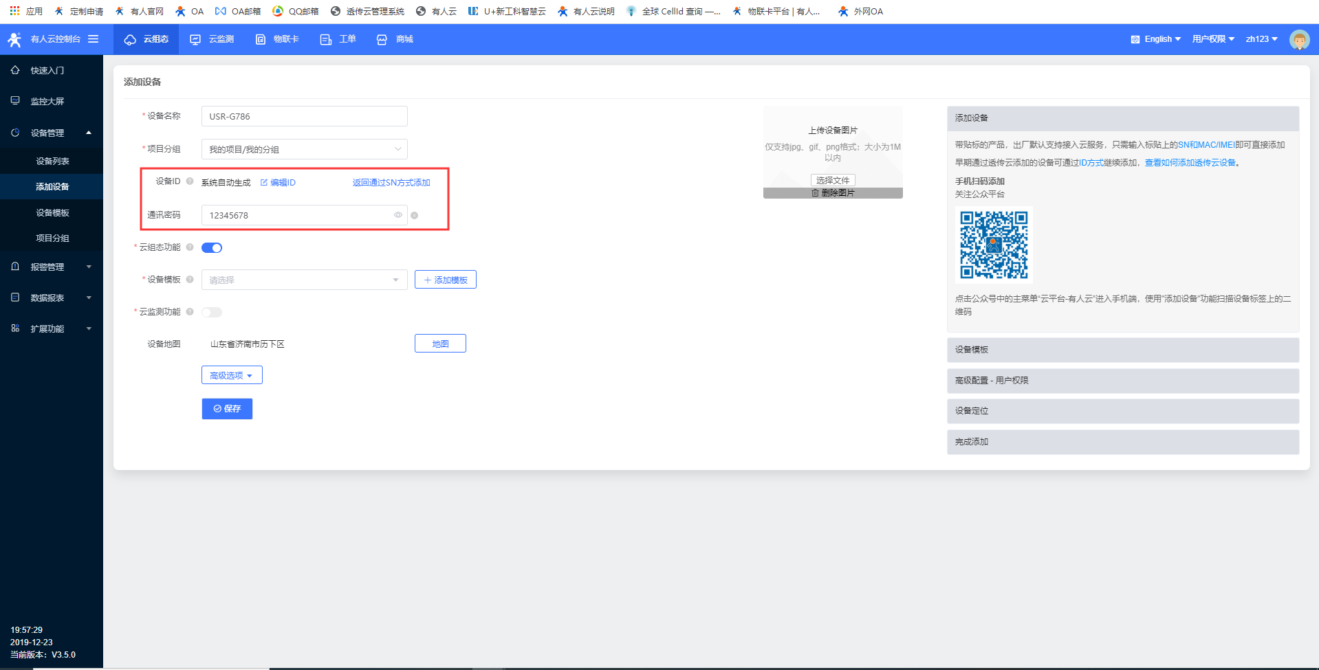 6、根據(jù)需要設(shè)置設(shè)備名稱(chēng)和項(xiàng)目分組,USR-G786選擇ID方式添加設(shè)備,ID和通訊密碼可以選擇自動(dòng)生成,也可以自行編輯(此處ID使用自動(dòng)生成,密碼為手動(dòng)添加)