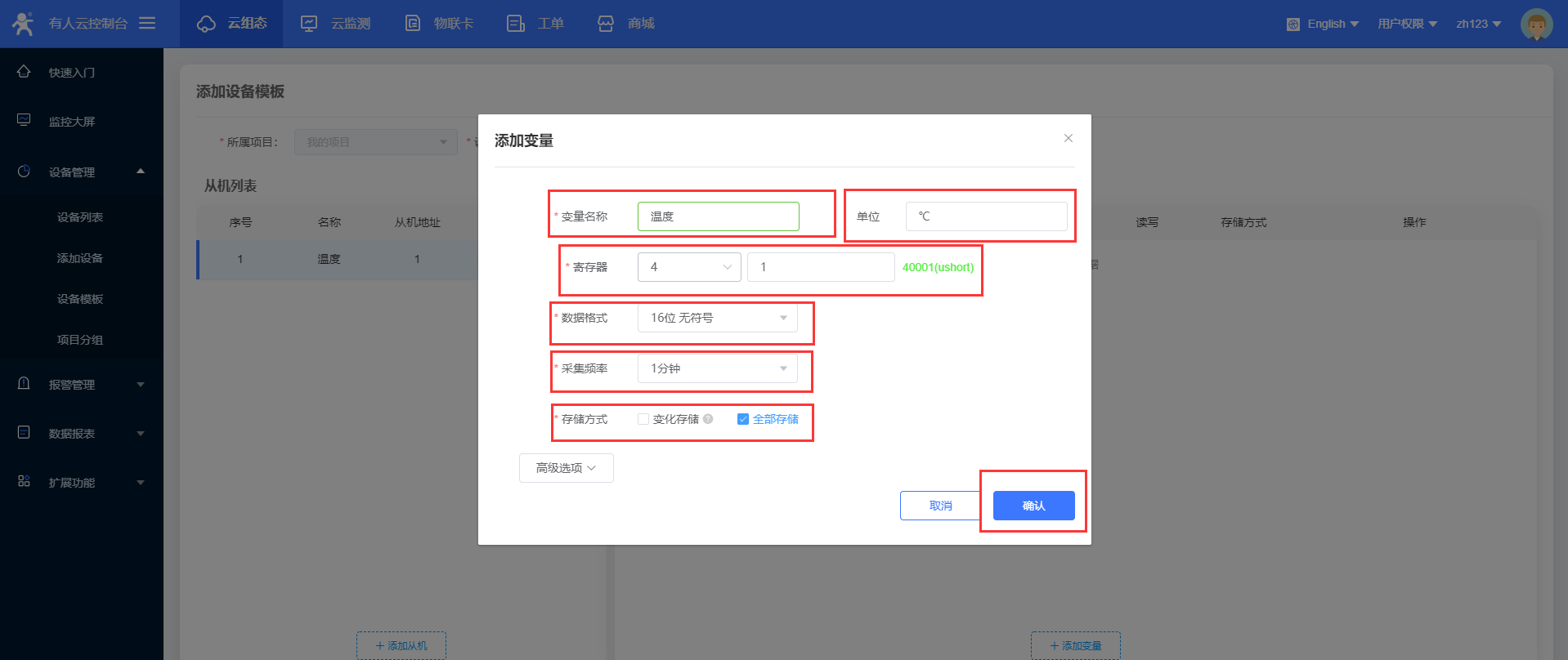 10、點(diǎn)擊添加變量,設(shè)置變量的名稱(chēng),寄存器地址,數(shù)據(jù)格式,采集頻率(最低只能是一分鐘);