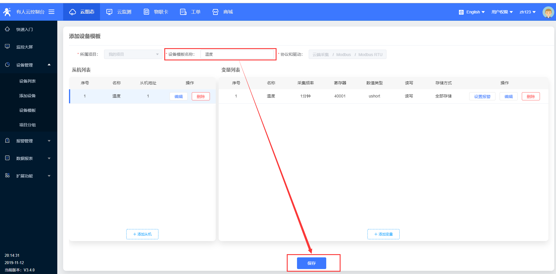 7、點(diǎn)擊添加模板,設(shè)備模板根據(jù)需要自行編輯名稱(chēng),選擇Modbus RTU協(xié)議,點(diǎn)擊保存;