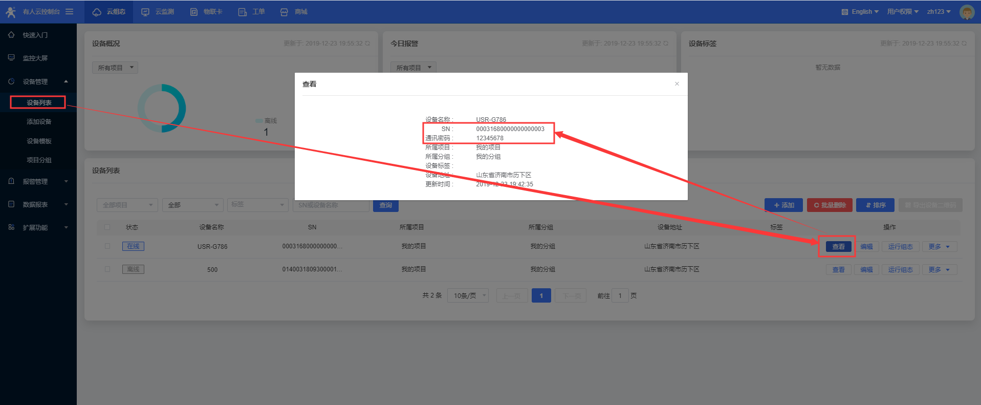12、添加完設(shè)備,可以在設(shè)備列表看到剛剛添加的ID和密碼(下面要用到);
